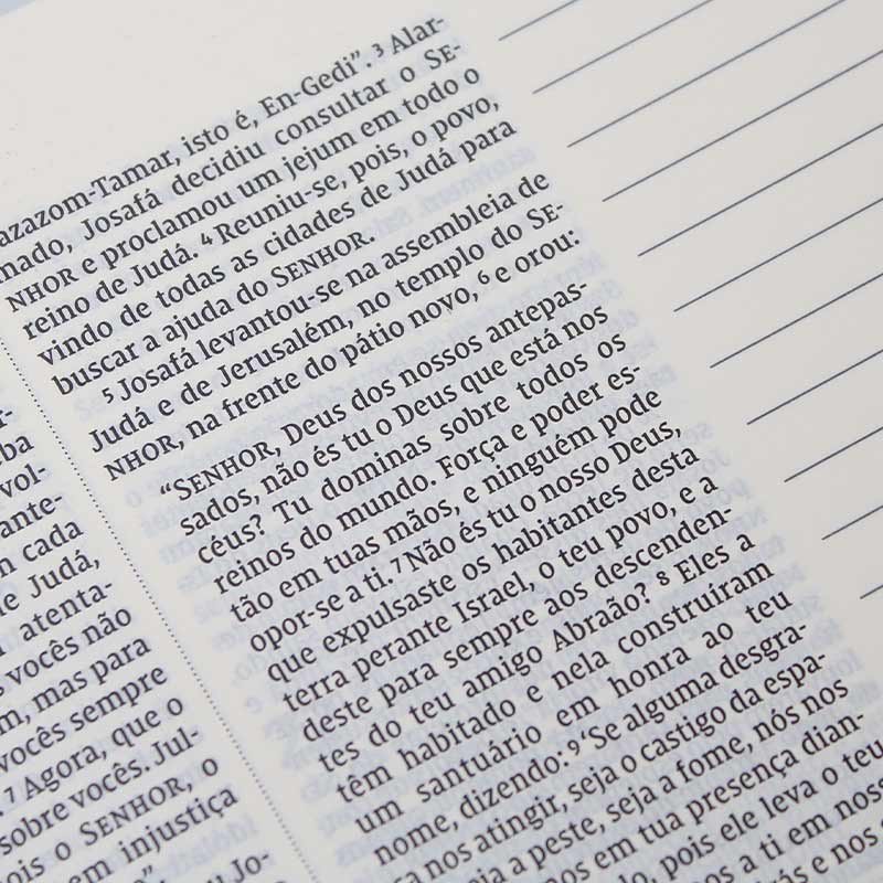 Quantas vezes estamos na igreja e ouvimos algo tão tocante que queremos registrar, mas não podemos porque não temos onde anotar? Você até gostaria de escrever na própria Bíblia, para que aquela informação complementasse seus estudos bíblicos, mas ela não tem espaço. Esta Bíblia chegou para resolver esse problema. Pensada para você que gosta de registrar comentários e anotações que enriqueçam a compreensão do texto bíblico, Sua Bíblia foi elaborada para incluir anotações sem prejudicar a leitura das Escrituras. Com papel diferenciado que dá mais destaque às suas anotações e mais visibilidade ao texto, graças a uma fonte especial desenvolvida pela Thomas Nelson Brasil, esta é a ferramenta ideal para aqueles que desejam aprofundar seu relacionamento com a Palavra.